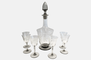 Indulge in the luxury of bygone eras with this exceptional vintage crystal decanter set, distinctively adorned with smoky gray accents. The decanter's base and lid, along with the stems of the six accompanying glasses, feature a rich smoky gray hue, setting this set apart in sophistication and style. Though reminiscent of esteemed brands such as Baccarat, Murano, or Lobmeyr, its...